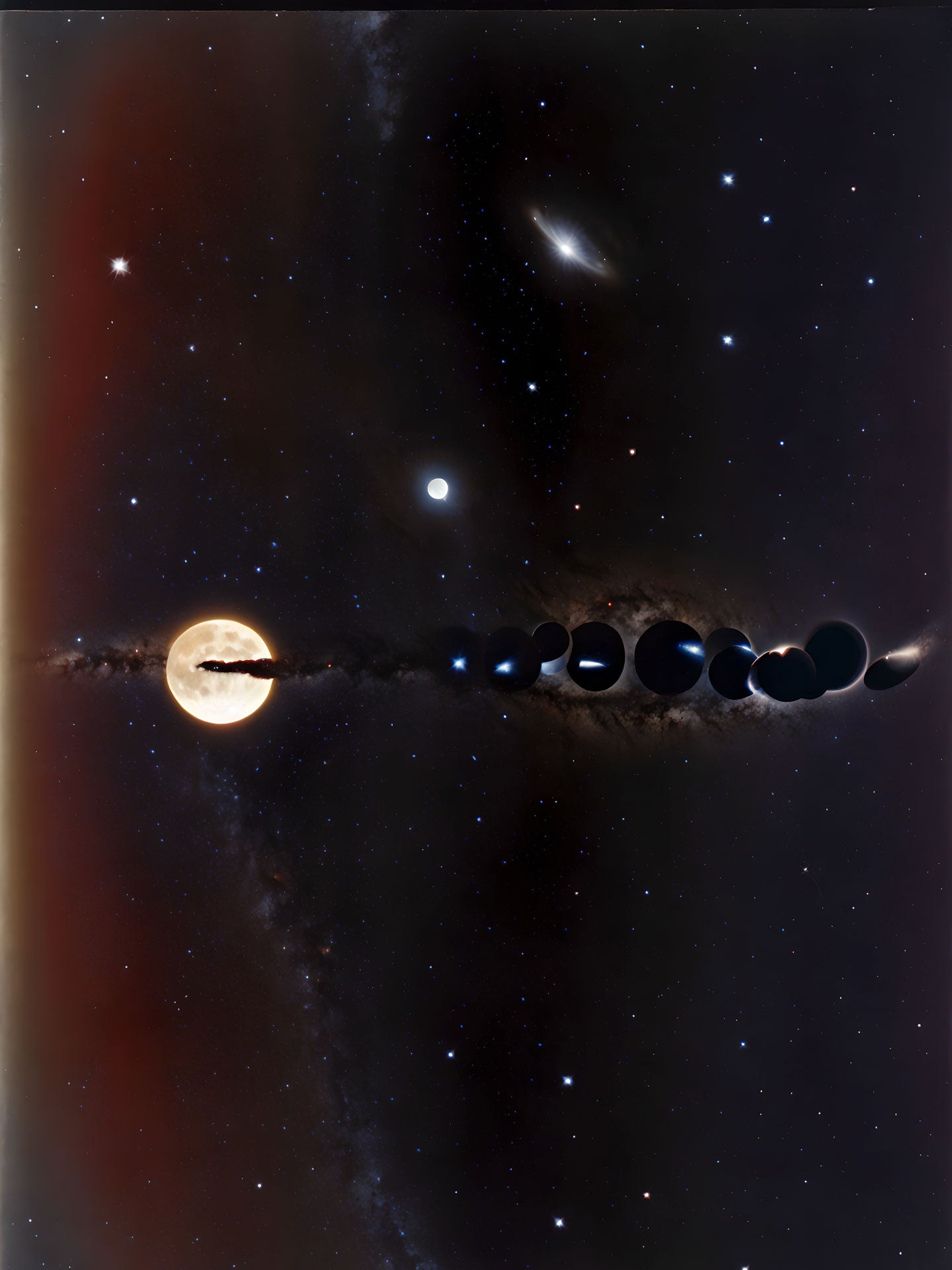 At its center is the horizontal axis: a sequence of dark, almost black spheres reminiscent of planetary phases or an abstract timeline. To the left is a luminous celestial body—sun or moon—and to the right, the gradual disappearance of light. This sequence evokes cycles: becoming and passing away, visibility and withdrawal. It is not a dramatic cosmic event, but a silent process beyond any human influence.
