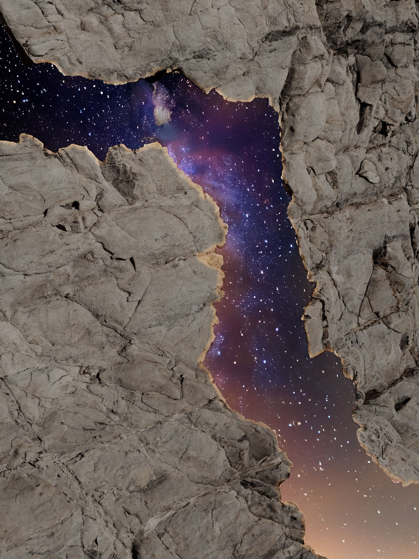 In The Silent Orders 2, Taketo Muroi shifts the focus from cosmic order to the boundary itself—to that fragile zone between matter and infinity. The image depicts a rocky surface, torn open like a geological wound. Through this opening appears not light in the classical sense, but a star-studded space, deep, cool, and of silent intensity.