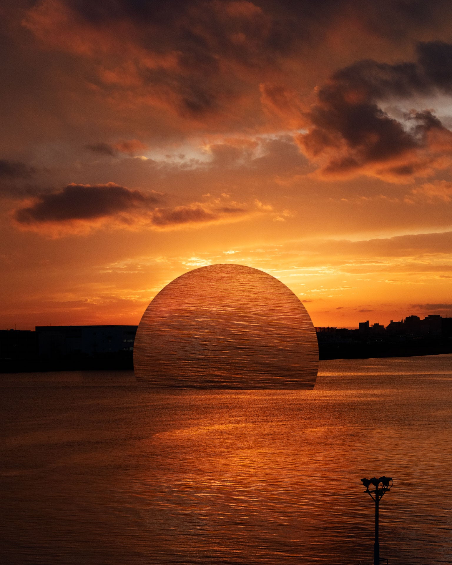 In The Silent Orders 3, Taketo Muroi condenses cosmic order into a tranquil, almost sacred scene. A monumental, perfectly sculpted disc rises from the water—half sun, half sign. It seems less to rise than to appear, as if it had always been there. The sky glows in warm, earthy tones; the city on the horizon remains a silhouette, an observer of an event devoid of drama.