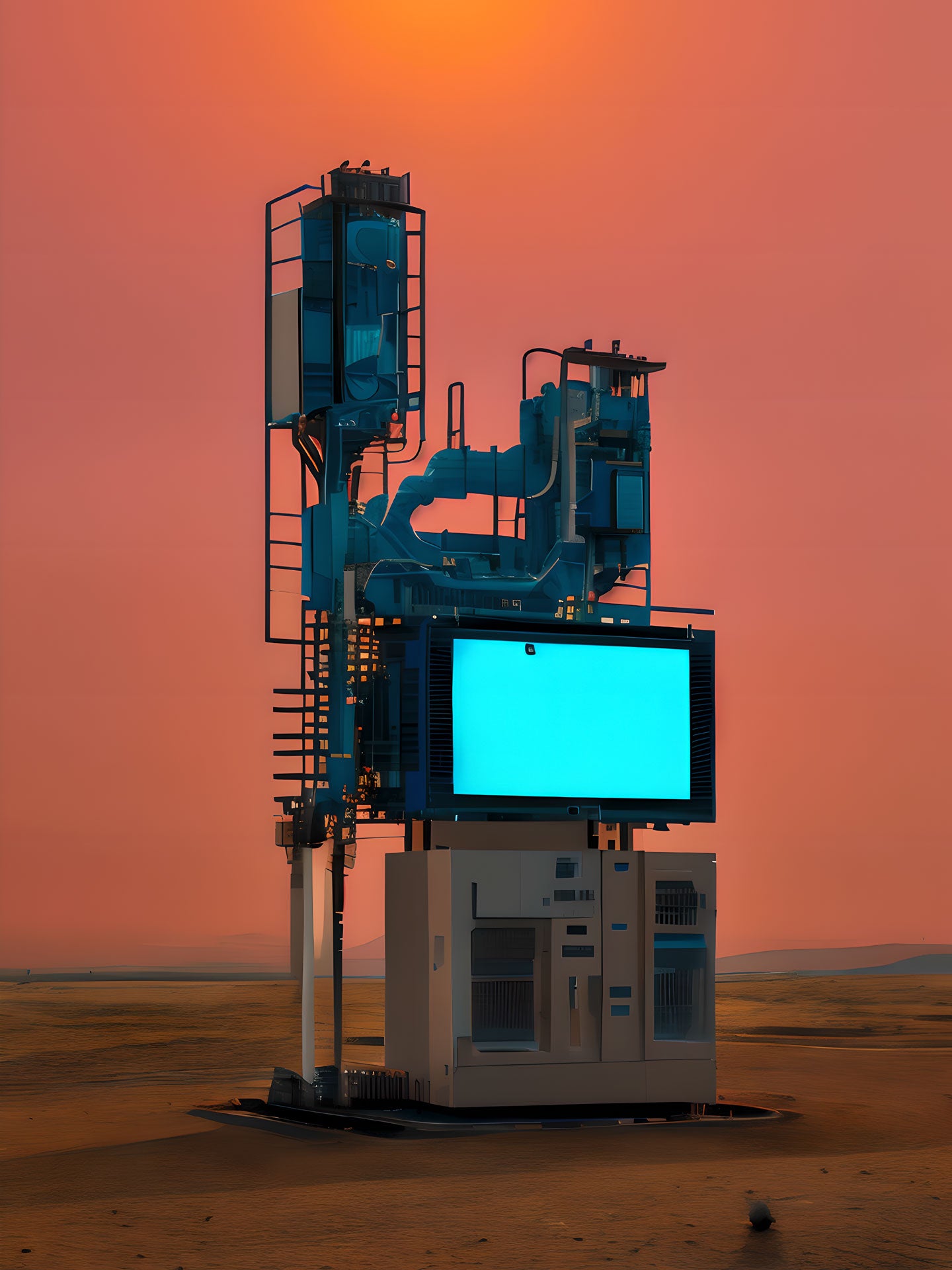 The structure stands isolated in a desert landscape, far removed from any urban logic. Pipes, modules, and scaffolding appear precise but not frantic—as if this machine were responsible not for production, but for maintenance. The luminous, empty screen at its center is crucial: it displays nothing, transmits nothing, demands nothing. This very emptiness points to power through potential rather than information. Order is not communicated here, but presupposed.