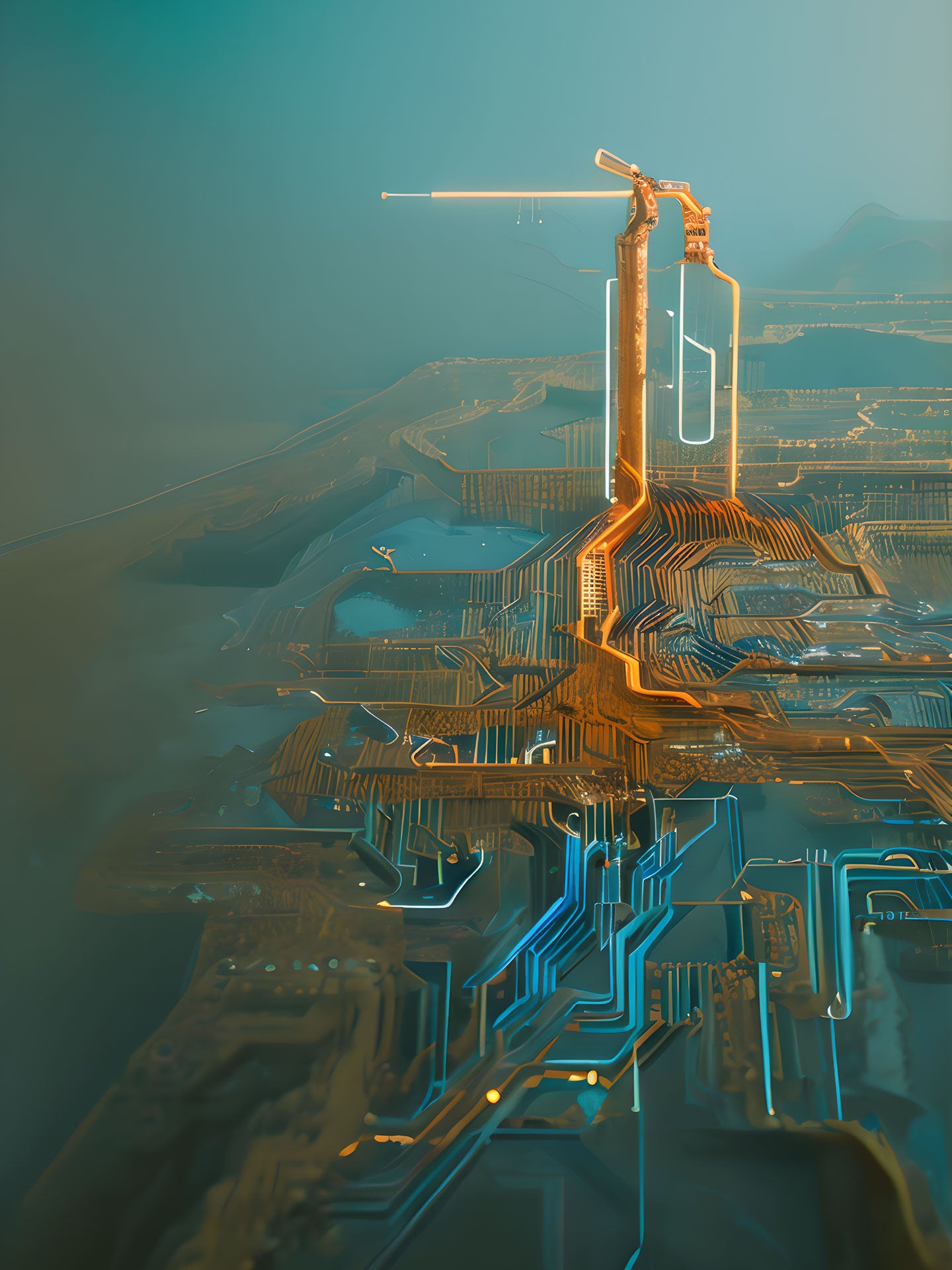 With No. 9, the series returns to a technological topography, but in a significantly refined, almost organic form. The image structure is reminiscent of a hybrid architecture of conductor tracks, circuits, and urban planes—a city that wasn't built, but rather grew organically. Copper and gold tones dominate the center, while cool blues and turquoises run beneath them like underground canals or data streams.