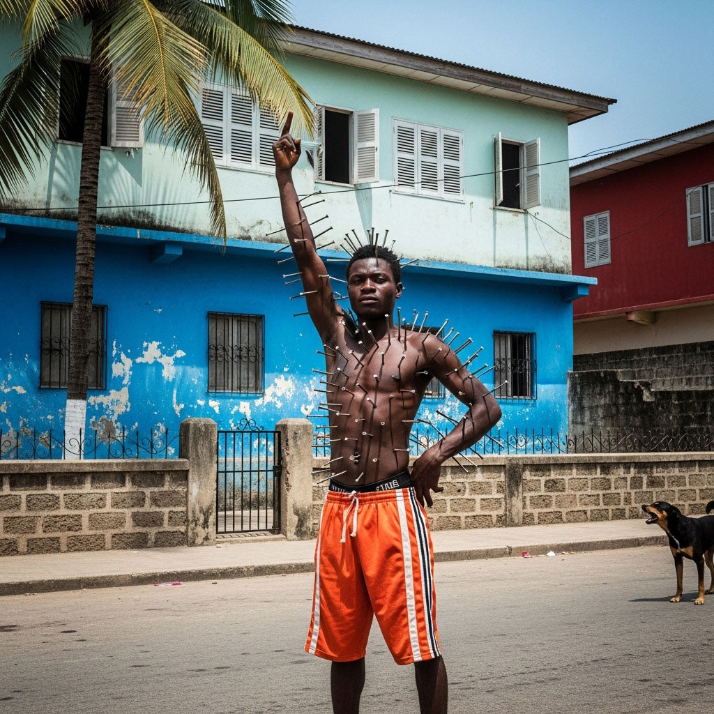 The scene takes place against a wall of tropical colors: blue, red, and green, houses that speak of heat, poverty, and dignity. Here, where the everyday persists in its raw beauty, the body becomes a monument. The nails are reminiscent of the Nkisi nkondi from the Congo, the figures into which iron was driven to seal contracts, prayers, or curses. But Wuh.ey brings this symbol out of ritual and into the street—into a present that must prove itself.