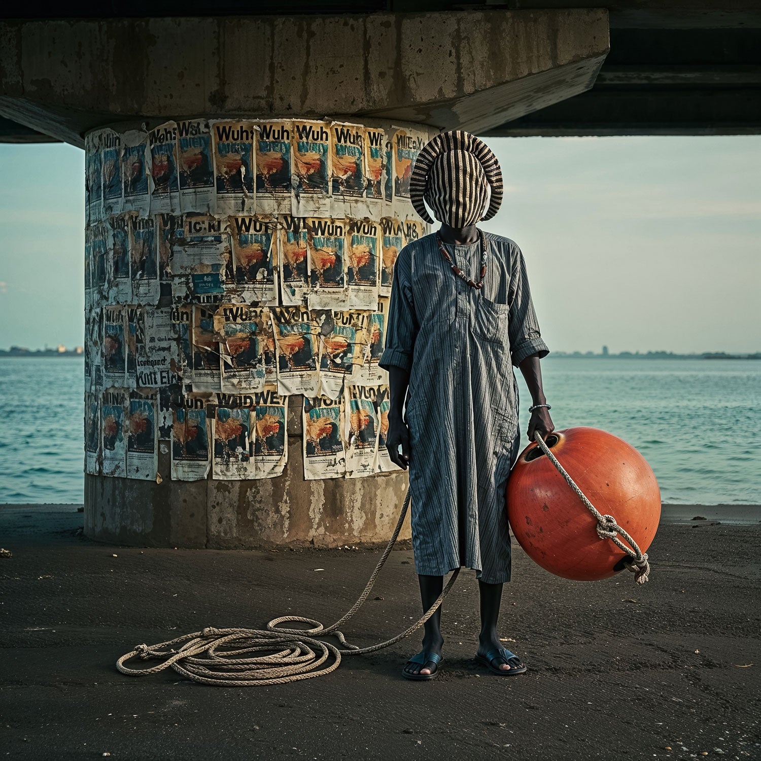 "Mtu wa Bahari" – the man of the sea – appears like a being between worlds. He stands where the water touches civilization. His masked figure eludes view; it rejects identity, attribution, and consumption. The sea is both origin and boundary – and the buoy a symbol of stability, of orientation in times of current.