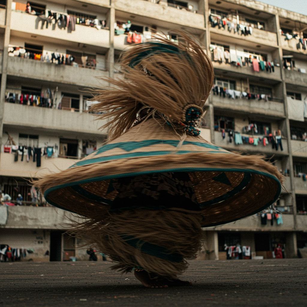 The dancer is barely visible; his body disappears into the costume, the movement, the dust. What becomes visible is pure energy. The weave of raffia and beads is reminiscent of Yoruba masks or Dogon dances, but here the ritual takes place in concrete, not in the bush. It's a new form of healing—urban, improvisational, electric.